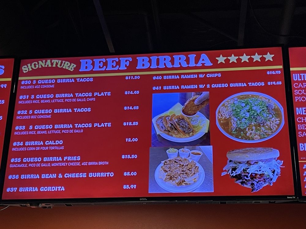 12 QUESO BIRRIA TACOS2 32OZ BIRRIA RAMEN1 BAG OF CHIPS5 MD COKE SODAONIONS, CILANTRO, SALSA LIMES